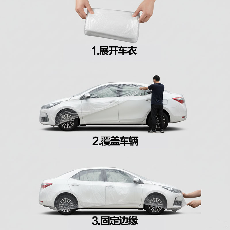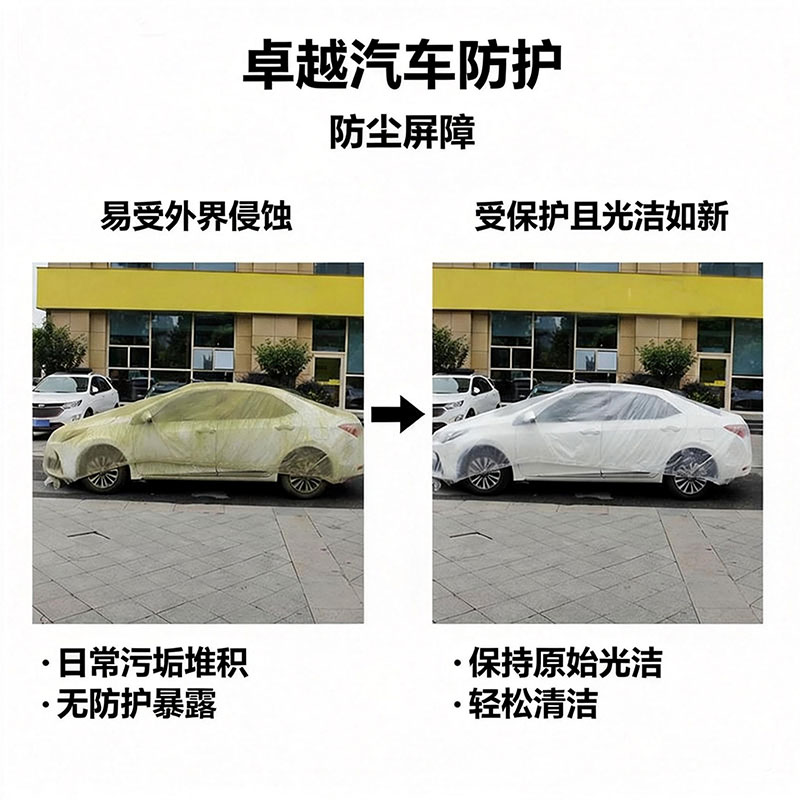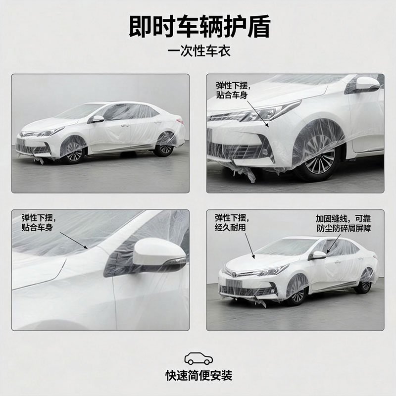 一次性PE汽車防塵罩是由聚乙烯(PE)薄膜制成的臨時(shí)防護(hù)罩。適用于短期停車場(chǎng)景,能有效防護(hù)車輛免受灰塵、落葉、鳥糞、小雨/小雪及陽光照射的影響。其核心特點(diǎn)在于一次性、便捷性、高效性與經(jīng)濟(jì)性,是汽車美容、維修保養(yǎng)、運(yùn)輸過程及短期戶外停車的理想選擇。