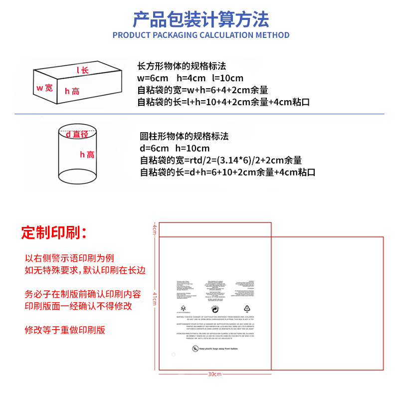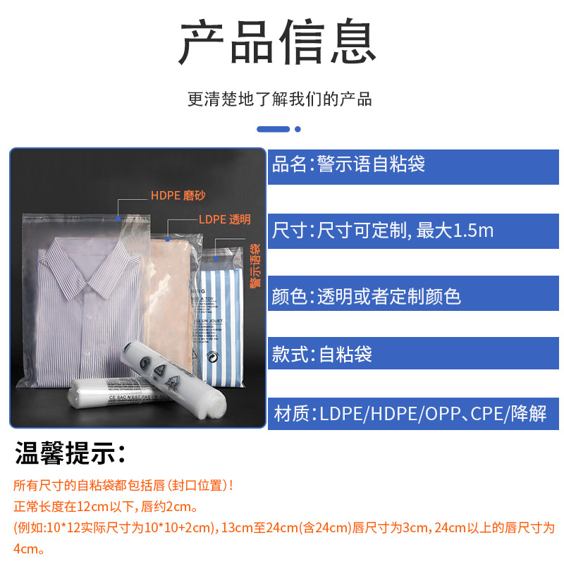 此款警示語貼膠袋,外包裝可按照客戶要求定制,如果過度包裝可能會導致價格成本上漲,請務必注意。